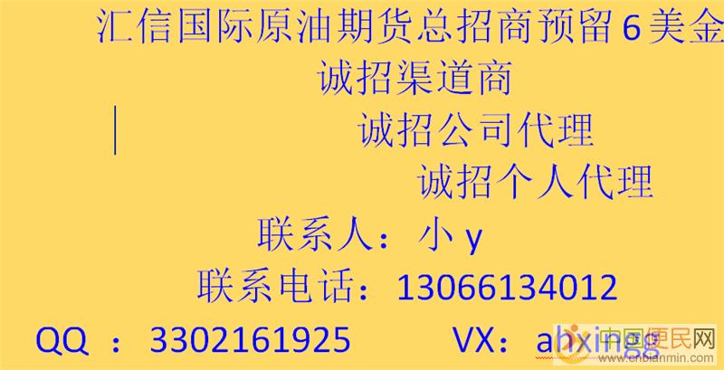 ★:佣金结算稳定、及时、不拖不欠(不交不扣)!! ★:技术部全天24小时在线,协助合作伙伴风控客户仓位! ◆服务最细致,合作更长久◆行情可单控,佣金日结◆ ★:预留最低以调至6美金 ★:主力产品:金、银、原油、德指、恒指等! 香港汇信国际原油期货诚招代理商预留6美金 联系方式:QQ:3302161925VX:ahxingg ...